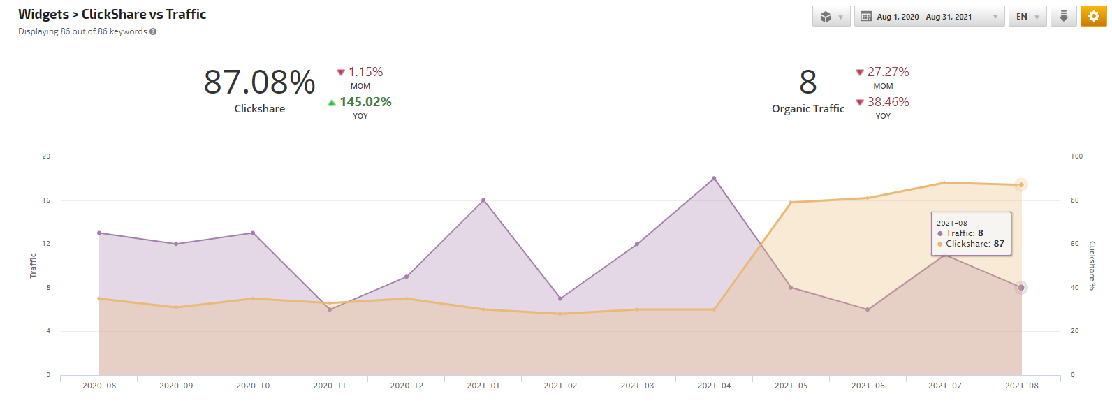 The ClickShare vs Traffic report provides a new, ClickShare metric that measures in % the click opportunity of the top 10 positions of the organic search results based on the Search Volume. The higher position keywords rank the better the ClickShare metric is. The Clickshare metric is based on Rank results collected in the campaign and the Search Console data combined, in which case both data must be available.