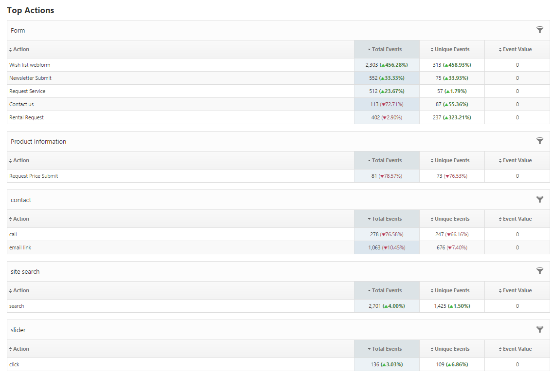 The Analytics Events Performance report provides analysis of traffic engagement with website events.