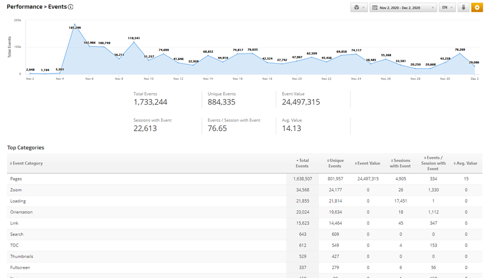This section demonstrates the total number of events that occurred during the report period and provides metrics such as the number of unique events, value (if a value exists in Analytics for an event), and sessions involving events.