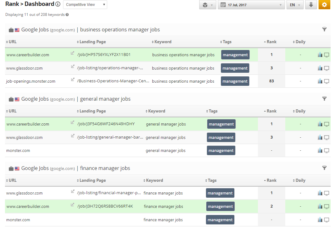 Tracking for Google Jobs results in Rank Ranger is provided via a Google Jobs search engine. Easy setup instructions are contained in this document, along with a sampling of reports that can be customized for analysis and client reporting of Google Jobs rank for the domain being tracked and its competitors. Rank is tracked for the top 100 Google Jobs search results (i.e., we provide up to 100 results, if Google serves 70 results for a keyword, then the report contains rank data for those 70 results).