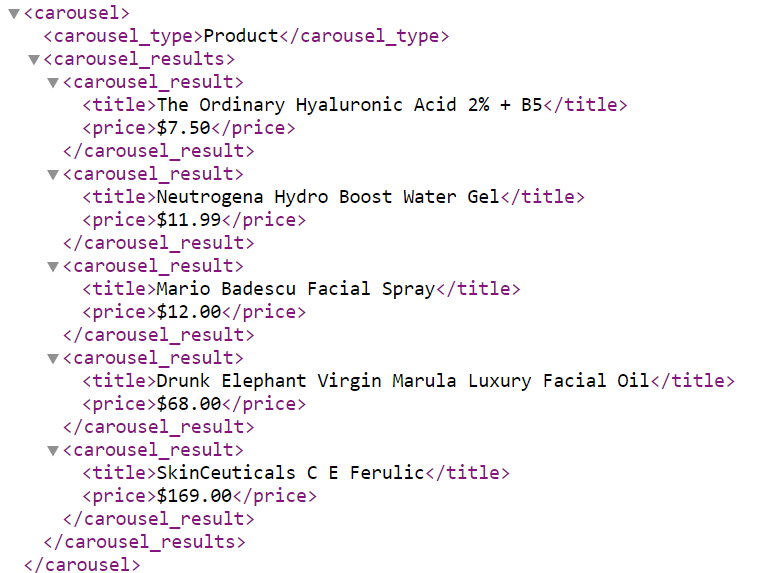If a Carousel exists in the search results for your keyword, the API indicates the type: Image or List, and provides up to 50 Image Titles.