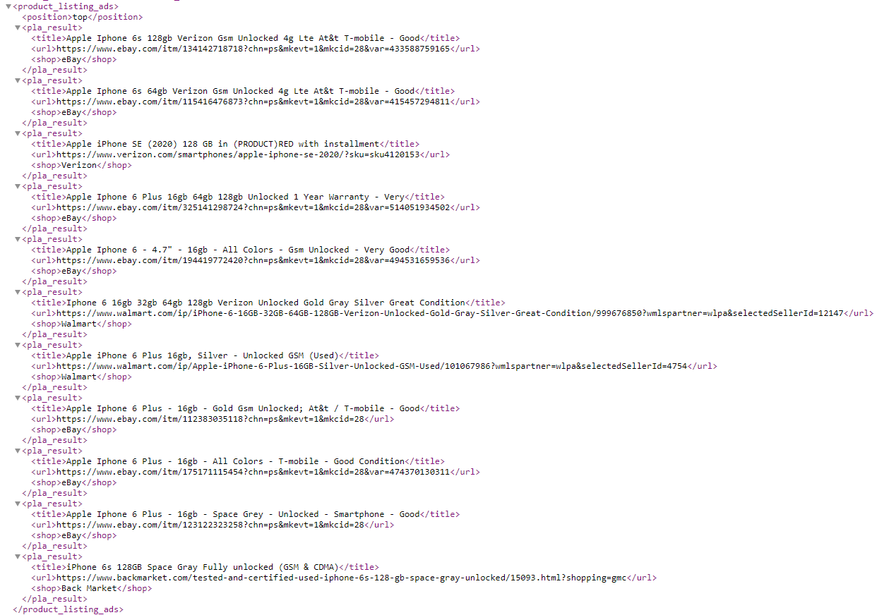 The google_serp_features API provides an indication of the existence of a Product Listing Ads in the search results for your keyword and includes the Title, URL, Shop, and Price as shown on the right side of the search result of the example below