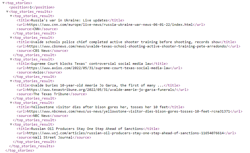 This illustration provides an example of our Rank Top 50 API results, demonstrating how results from the SERP are presented (Rank Top 100 and Search Query APIs deliver that data in the same way).
