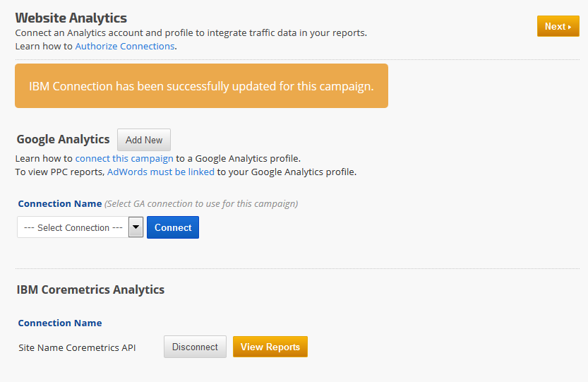 You can connect your campaign to your IBM Coremetrics Digital Analytics profile if you'd like to provide us with access to website analytics data for integration into your reports.