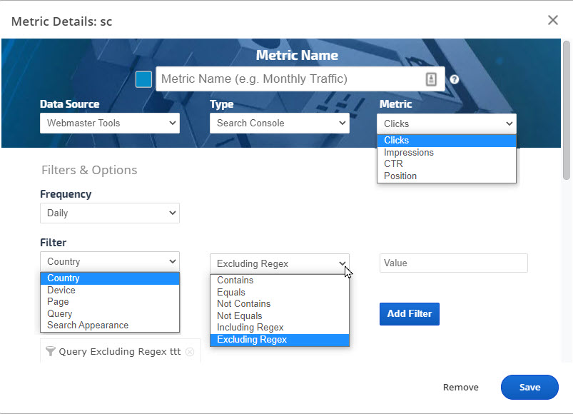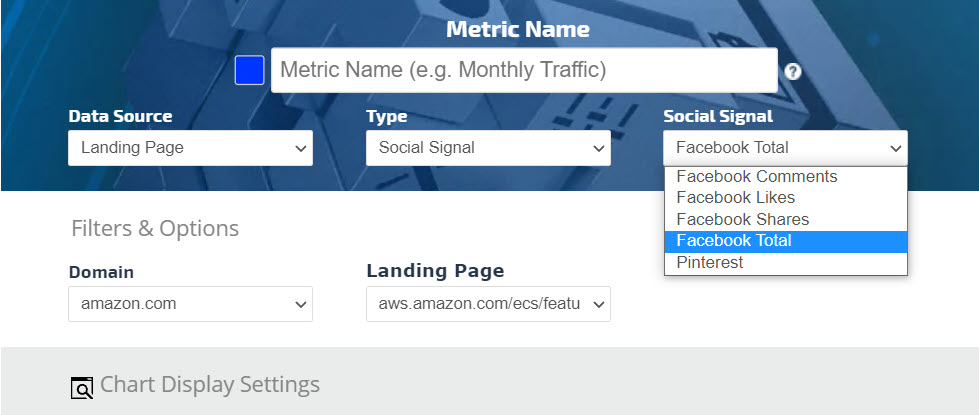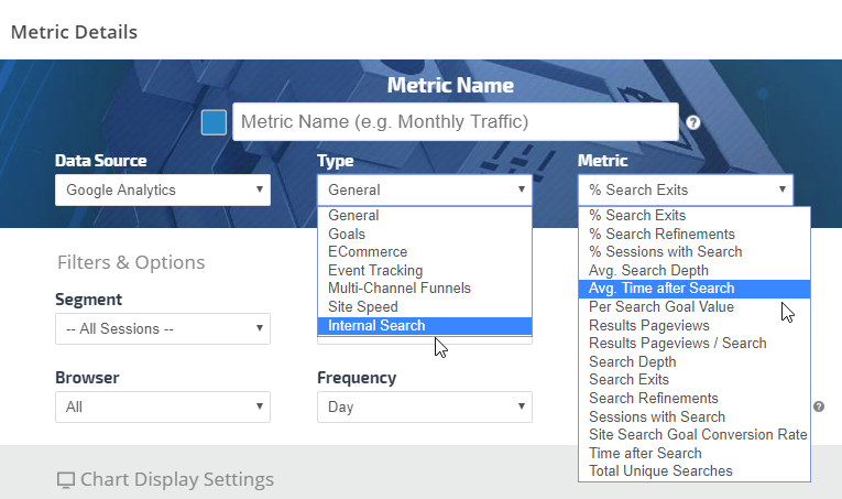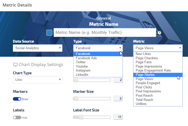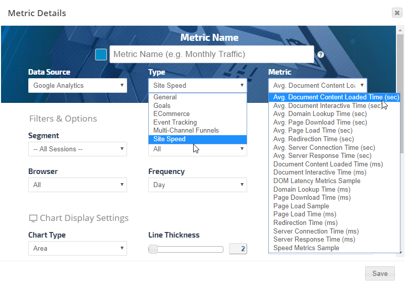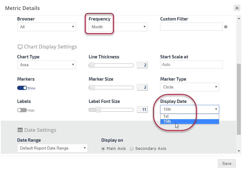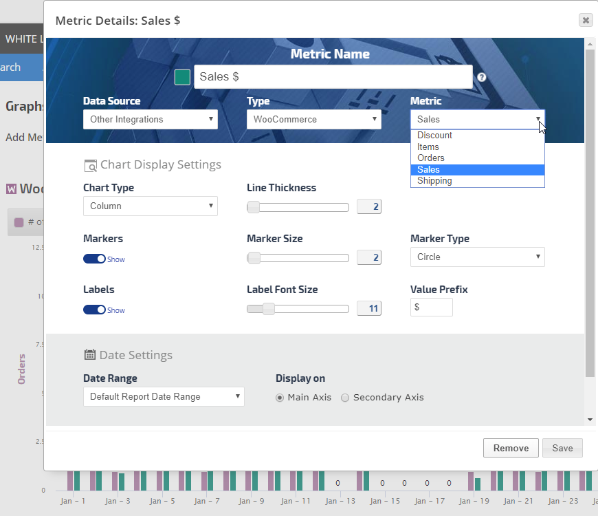 • Click the Add Metric button to create a new metric. Refer to Add Metric, Metric Settings, Display Settings, and Date Settings sections below for a description of the many available options.