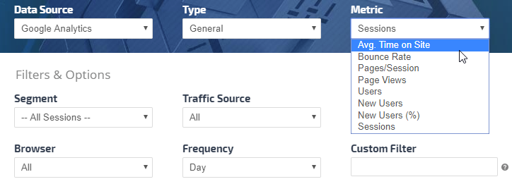 • General: Average Time on Site, Bounce Rate, Pages per Session, Page Views, Sessions, Users, New Users, and New Users (%)