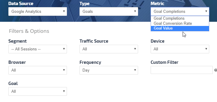 • Goals: Goal Completions, Goal Conversion Rate, Goal Value