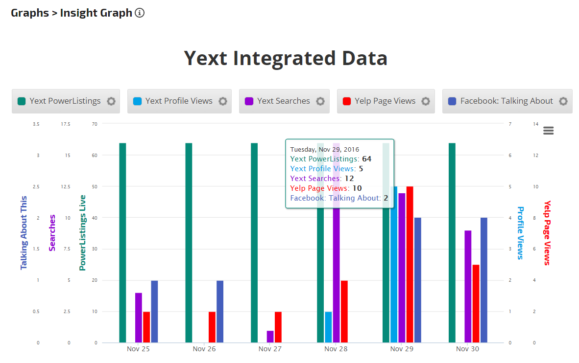 Yext: Average Rating, Facebook Check-ins, Facebook CTA Clicks, Facebook Page Impressions, Facebook Page Post Impressions, Facebook Page Views, Facebook Talking About This, Facebook Likes, Facebook Were Here, Featured Message Clicks, Foursquare Daily Checkins, Google Customer Actions, Google Customer Actions Phone Calls, Google Customer Actions Get Directions, Google Customer Actions Website Clicks, Google Map Views, Google Search Views, Google Search Queries, Google Search Queries Direct, Google Search Queries Discovery, Instagram Posts, New Listings Live, New Reviews, PowerListings Live, Profile Updates, Profile Views, Publisher Suggestions, Searches, Social Posts, Yelp Customer Actions, Yelp Page Views