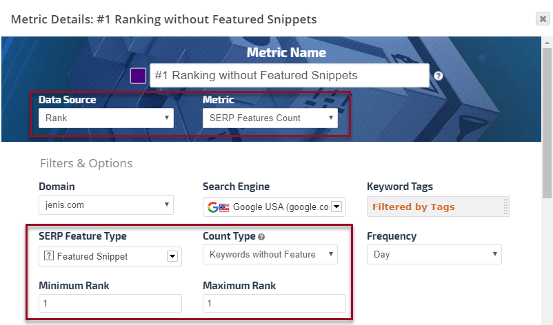 Certain SERP metrics also have options to display data either by the average number of occurrences per page or as a percentage.