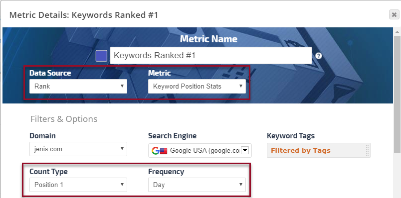 Average Rank is the average rank of all campaign keywords combined for the selected time period. When you select the Average Rank Metric Type, you have a variety of options and filters to utilize for customizing your Insight Graph.