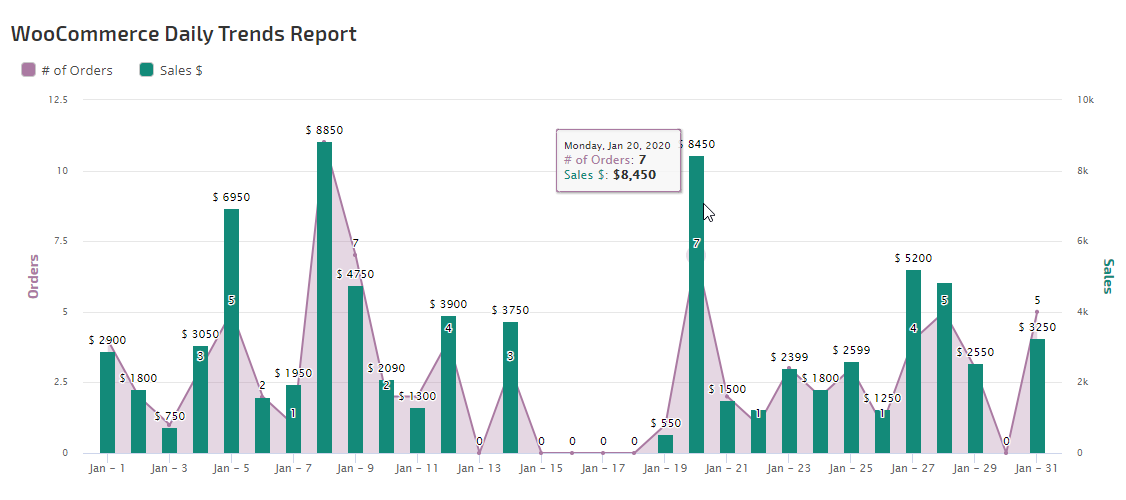 Compare results to the previous period, same time last year or select your own custom date range, and view with your choice of Main or Secondary Axis options.