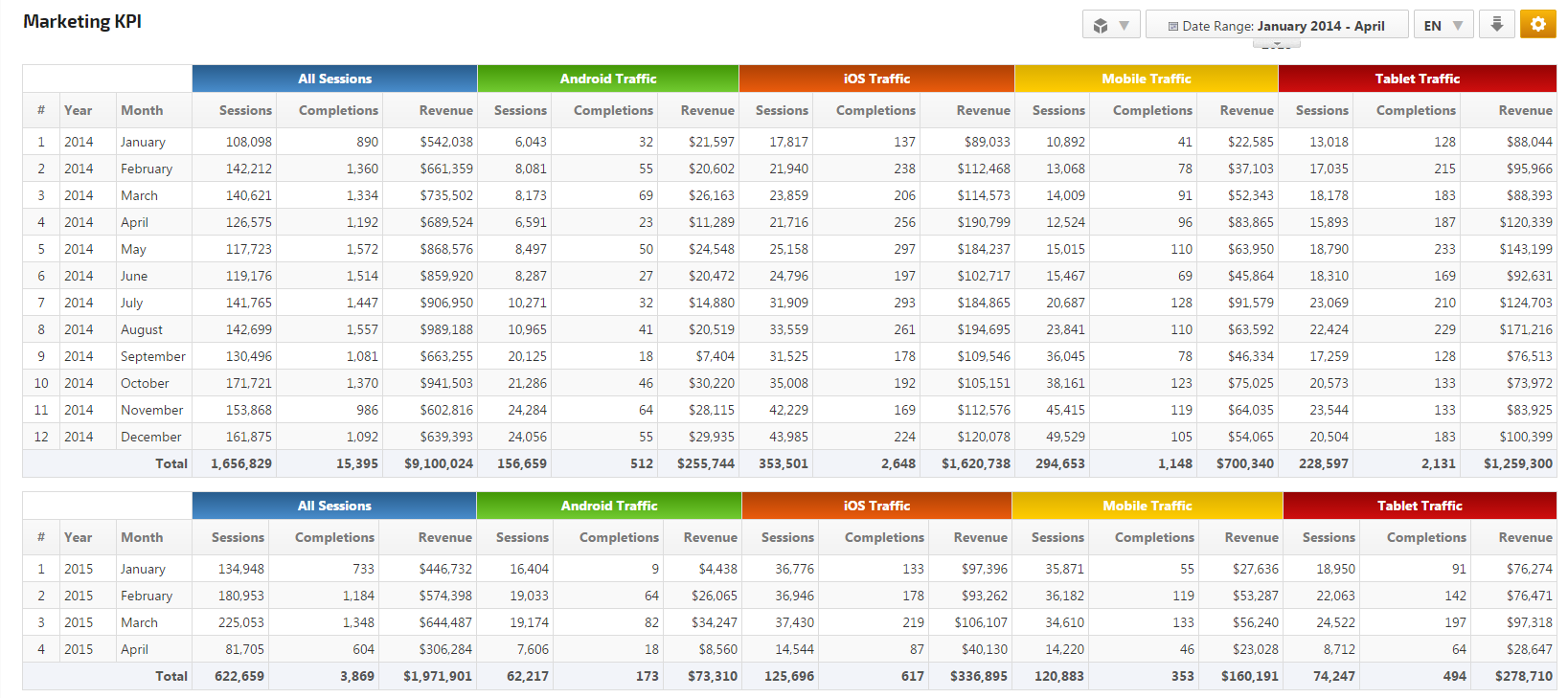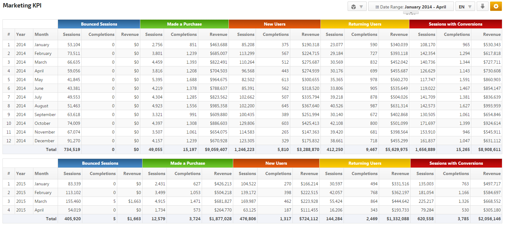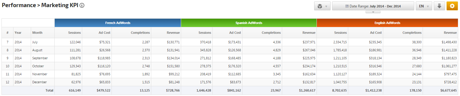 Measure and analyze the performance of online marketing campaigns and monitor trends with our Marketing KPI report. Select up to 5 segments at a time to create customized reports to determine Advertising ROI, the value of Mobile traffic, Referral and Direct vs. Search traffic or Organic traffic vs. Paid traffic, Goal Conversions, Revenue, user type and behavior, etc.