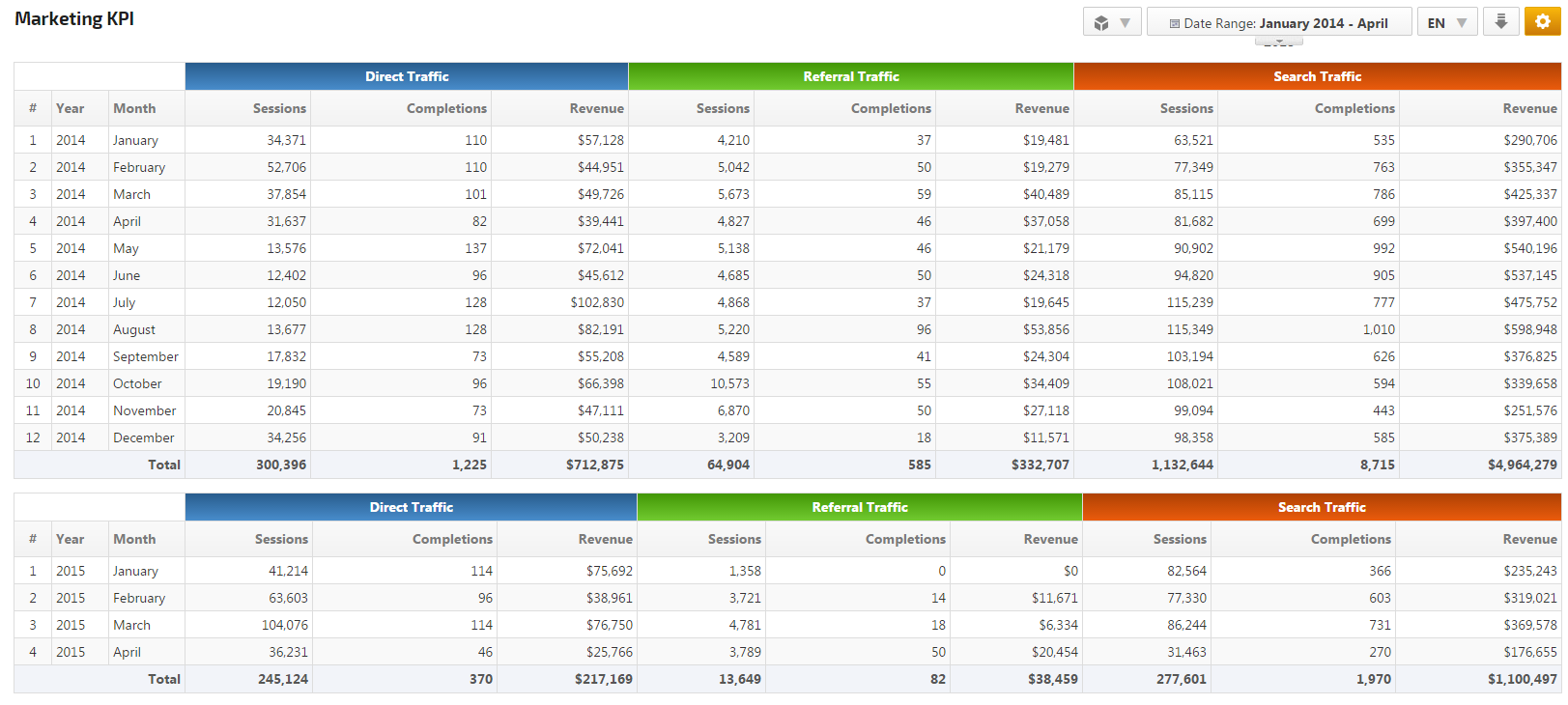 What source is resulting the largest revenue stream to your site - Direct, Referral or Search Traffic? Find out by simply selecting those marketing segments in the Marketing KPI report.