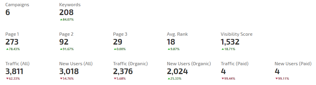 • Search Engines: the average rank change percentage for each search engine that the campaign keywords are being tracked on