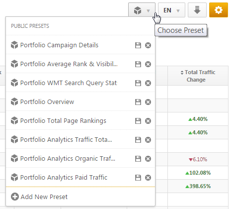 The Portfolio Report places an abundance of rank and traffic metrics at your fingertips, but since it may not be comfortable to view dozens of columns across a screen, we recommend using Report Presets to create and save the settings for the variety of management reports you may need.