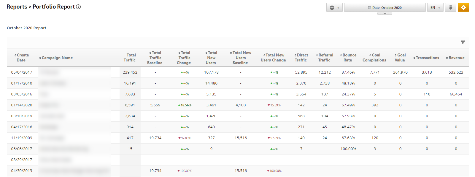 View and compare baseline and current Analytics Total Traffic and New Users, along with a percentage of change for all campaigns in your account.