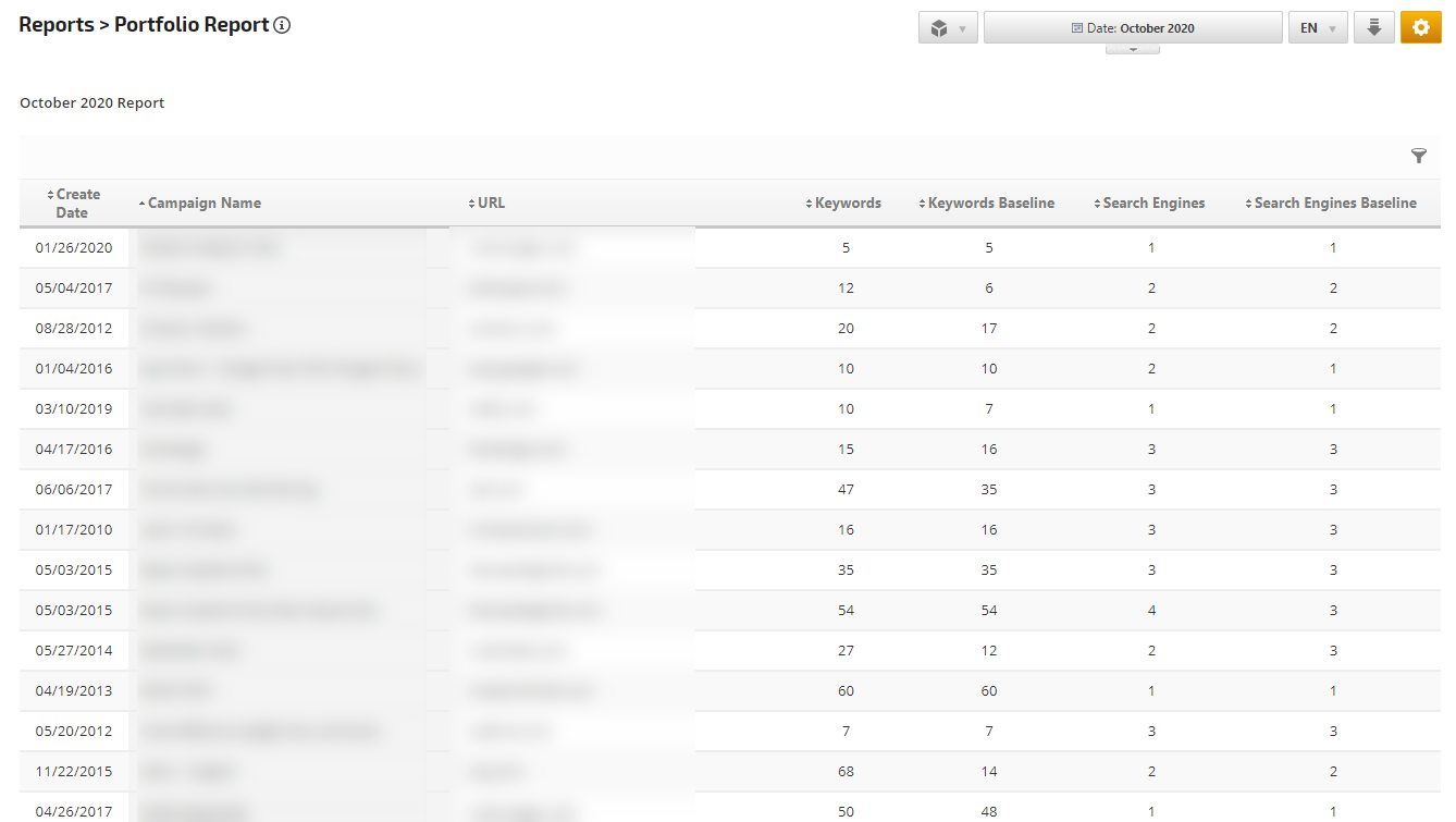 The Portfolio Report is an Enterprise tool that provides management with the ability to analyze the performance of all SEO and online marketing campaigns on one screen.  This report contains many options for comparing baseline data to current data and viewing comparison change calculation, as well as a change per search engine.