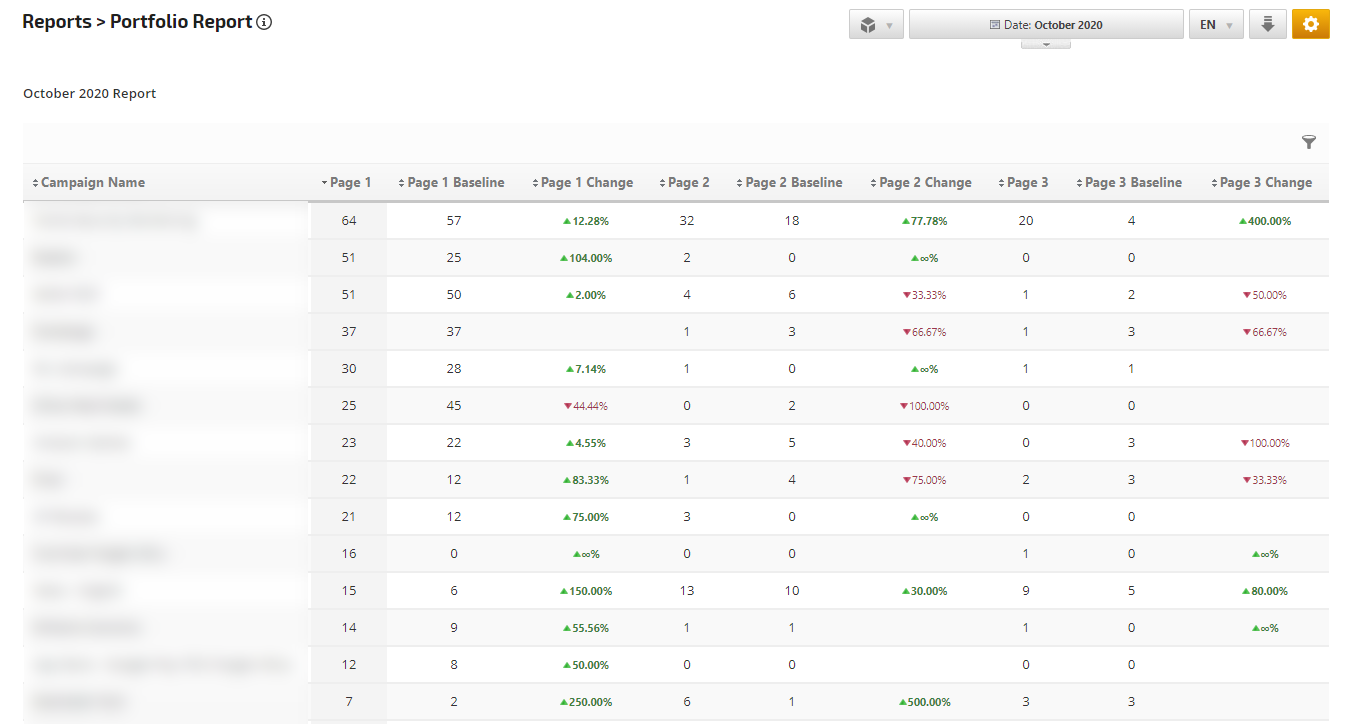 View and compare baseline and a current number of pages occurring on Page 1,2 & 3 of the combined search engine results, along with the percent of change between baseline and current top page rankings for all campaigns in your account.