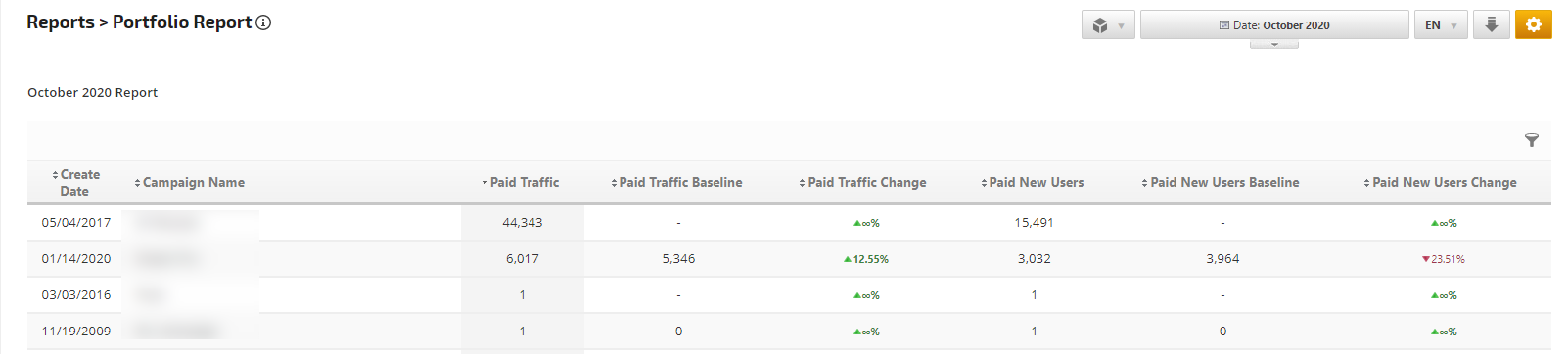 View and compare current and baseline Paid Traffic and New Users, along with a percentage of change for all campaigns in your account.