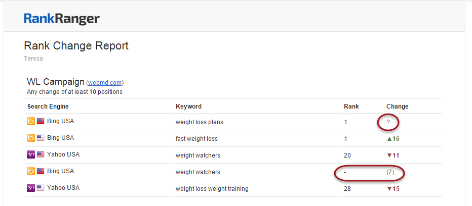 A question mark ? signifies that RangerBot is unable to calculate the difference between the previous rank and current rank; most likely because the previous rank did not fall within the maximum number of results tracked. In the example above, we're viewing a weekly rank change report and the keyword "weight loss plans" dropped from the top 100 results in Bing USA search a week prior to the report date, and then recovered in the number 1 rank position on the report date.  This may have been due to a number of factors including campaign settings changes, a Bing algorithm change or experiment at a particular data center, or even highly aggressive competitors.