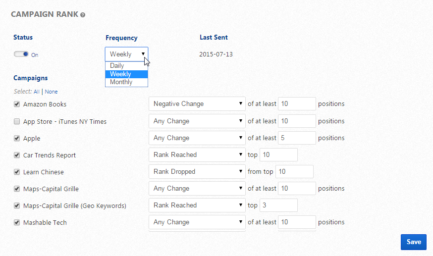 Select the frequency, campaigns, and type of change rules that you want to trigger a Rank Change Report to be sent to you daily, weekly or monthly.