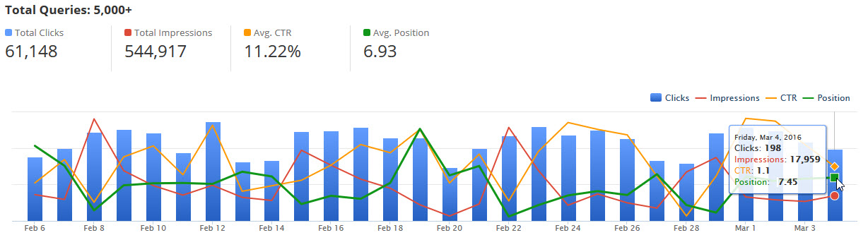 While viewing the graph, you can hover over any point to view the number of Impressions, Clicks, CTR, and Average Position for a specific date.