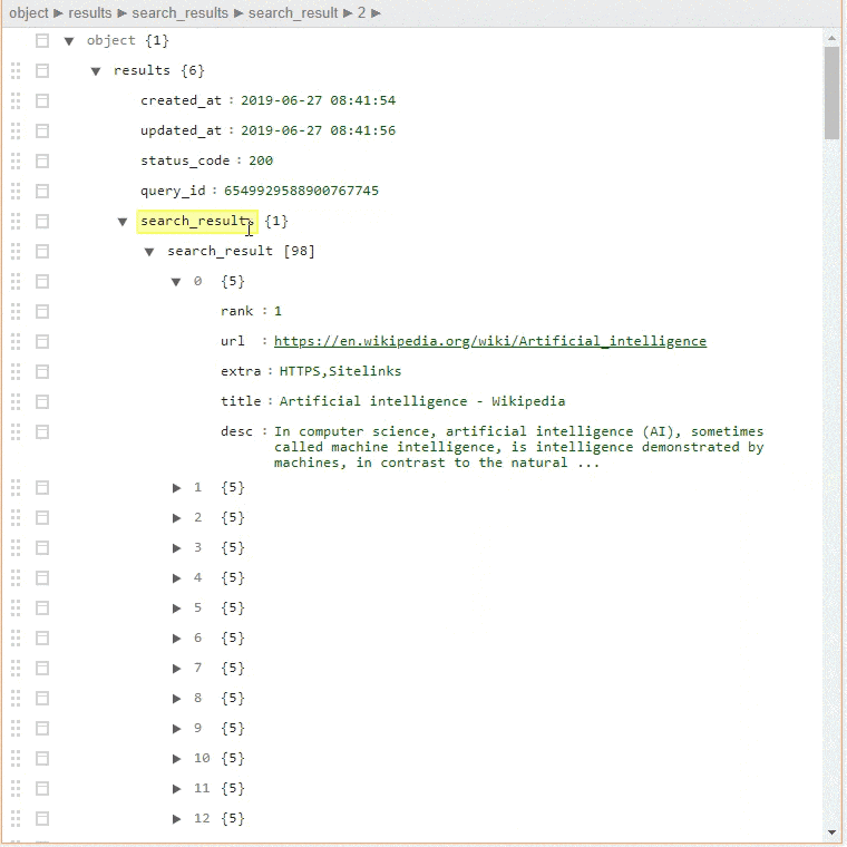 Search Query API Parsed JSON Results