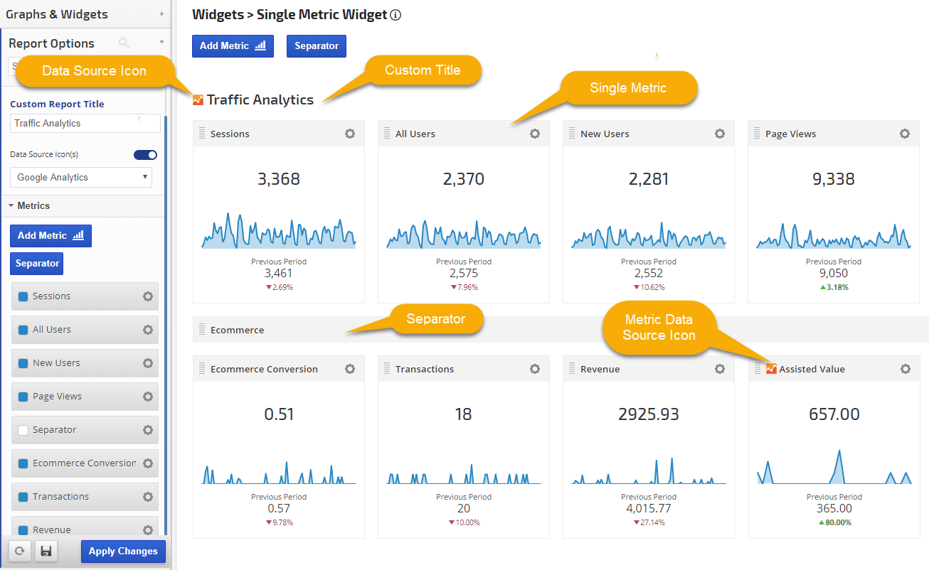 - Commerce Metrics: Items per Order, Total Items Ordered, Total Orders, Total Product Views, and Total Sales