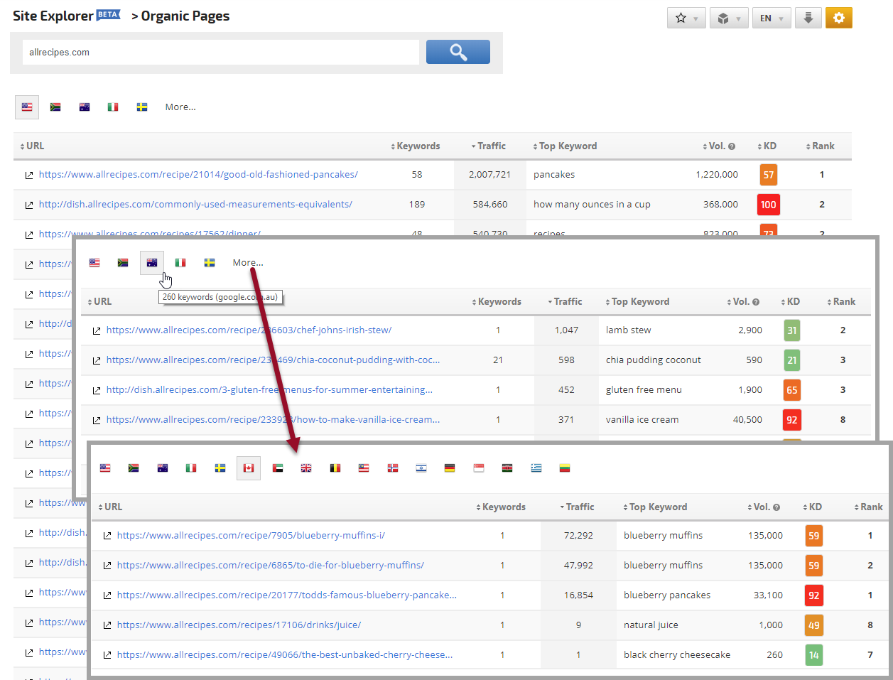 - Click the URL to launch the Organic Keywords report filtered for the landing page to view all the keywords that the landing page ranked for