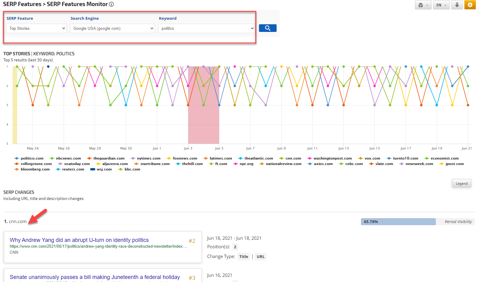 In this example, the SERP Features Monitor tool was used to look for the Top Stories SERP Feature on the Search Engine google.com (US desktop) for the keyword "politics". The first site that appears in the monitor for the given keyword is "cnn.com".