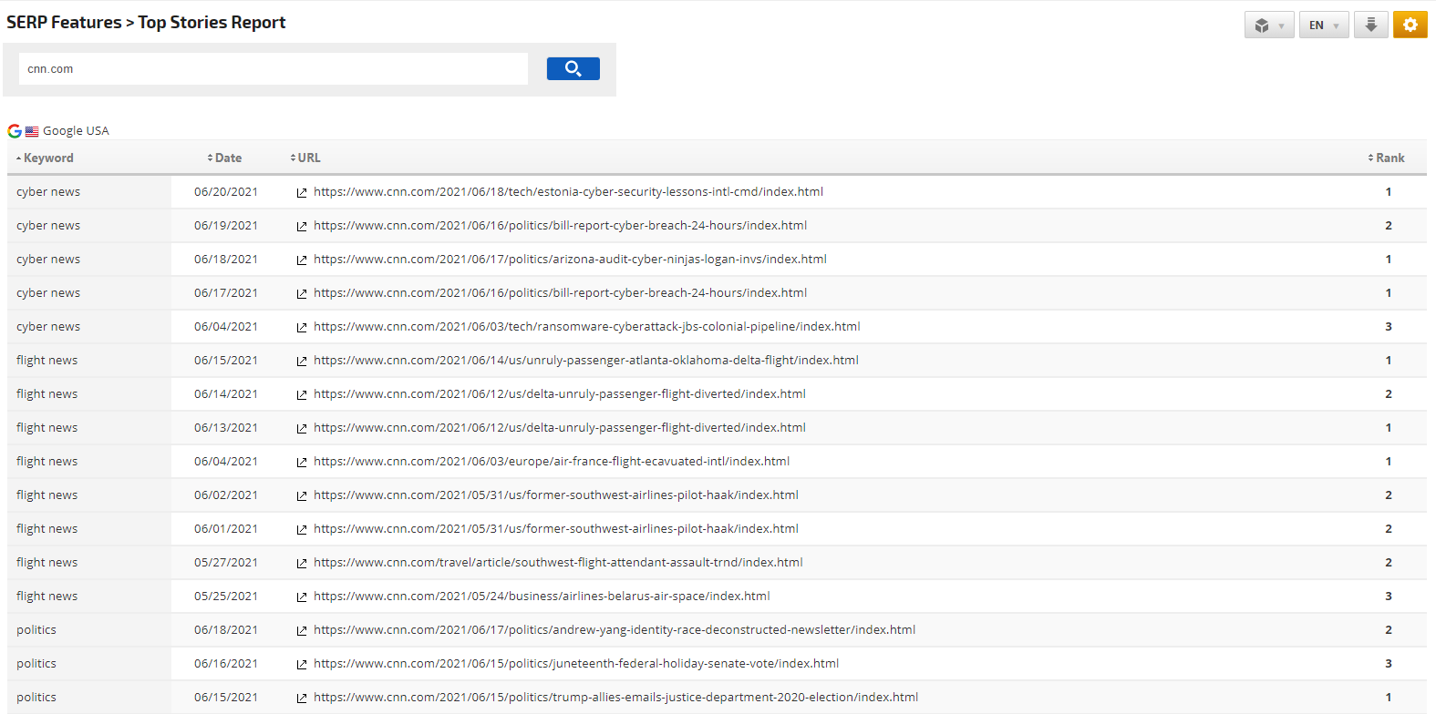 Going back to the Top Stories Report, run the report for the domain "cnn.com" on the google.com Search Engine. The Top Stories Report will display the list of keywords including the researched keyword with the date and rank for the Top Stories SERP Feature.