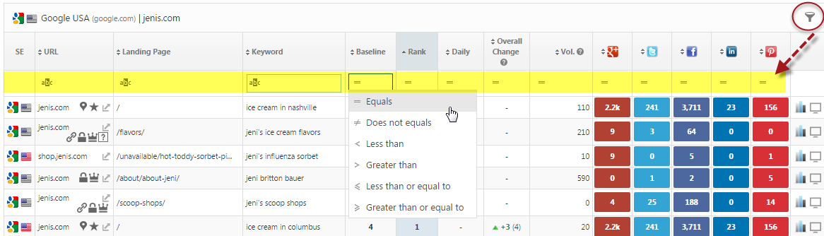 Click the filter icon in the top right corner of reports to access a search row field that can be used to further filter your report results to locate specific keyword results, URL, etc. This is very helpful when managing SEO campaigns that contain hundreds or thousands of keywords.