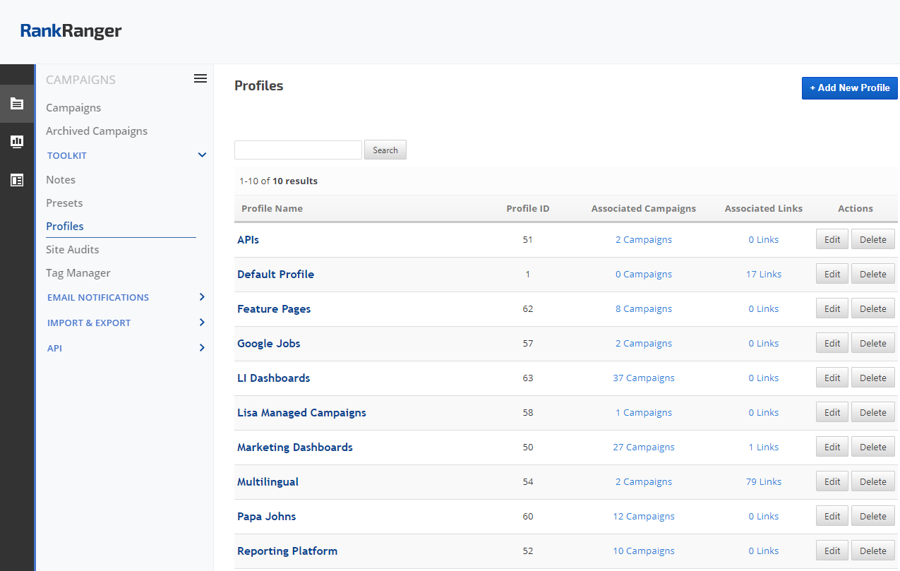 Profiles for the organization of rank tracking and link building campaigns into associated categories. This feature is also used to group multiple campaigns together in one white label client dashboard for