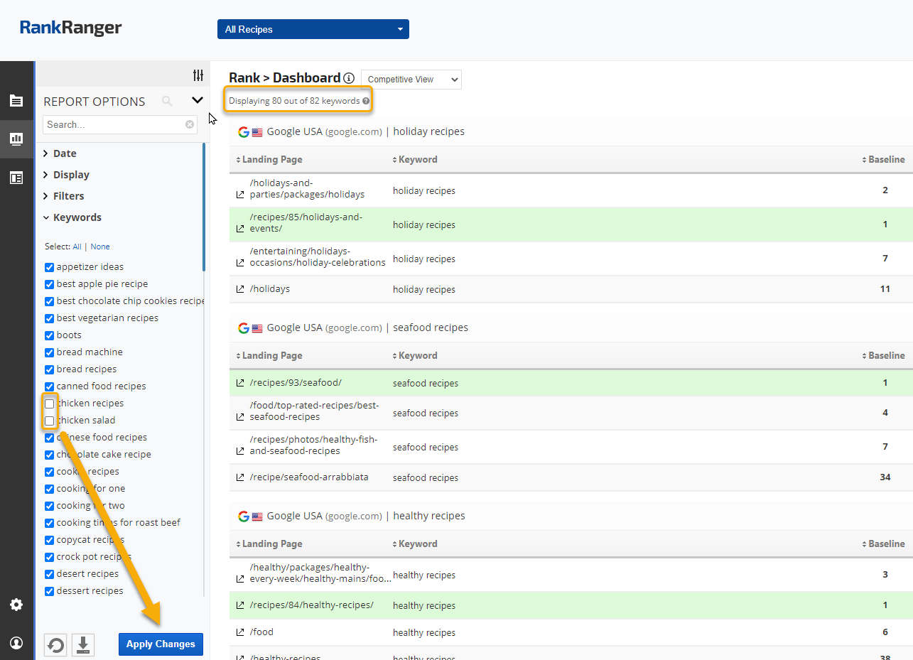 Apply Changes button to display all keywords in your report. The number of