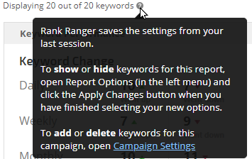 keywords currently included in your report displays directly below the report