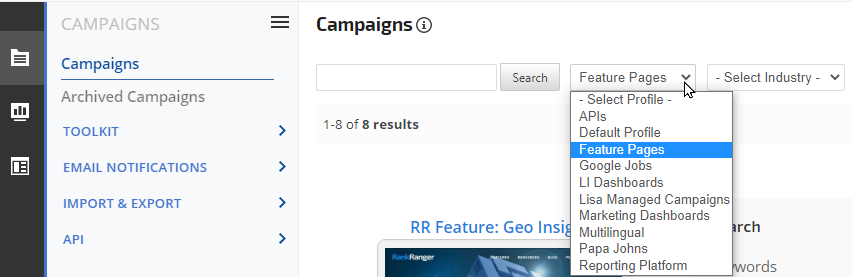 Search for a Campaign by phrase and/or filter the results by Profile or Industry