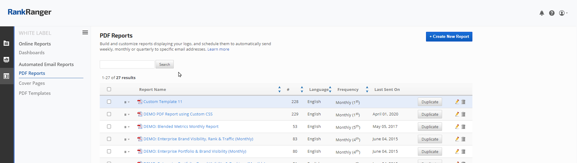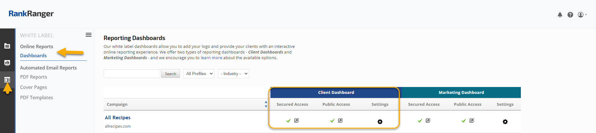 Client Dashboards can be found in the White Label section of Rank Ranger. This feature allows you to provide your client with their own user dashboard to our system, under your logo. This is ideal for online marketing companies that would like to give their clients the ability to be as hands-on as they like with their projects.