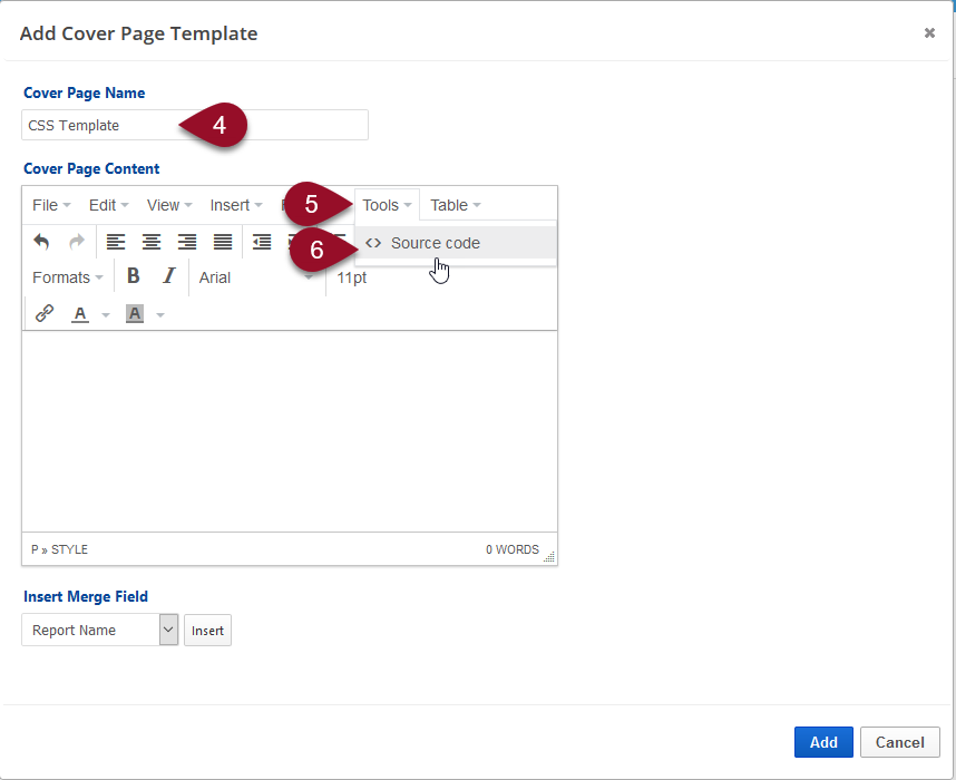 • Below the editor screen there is an Insert Merge Field pull-down menu. To insert a merge field, place the cursor in the Cover Page Content area where you want the field to display, select the field name and click the Insert button.